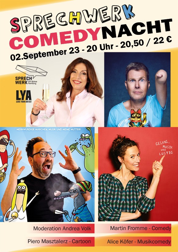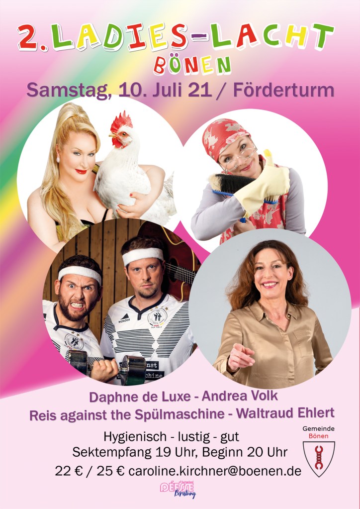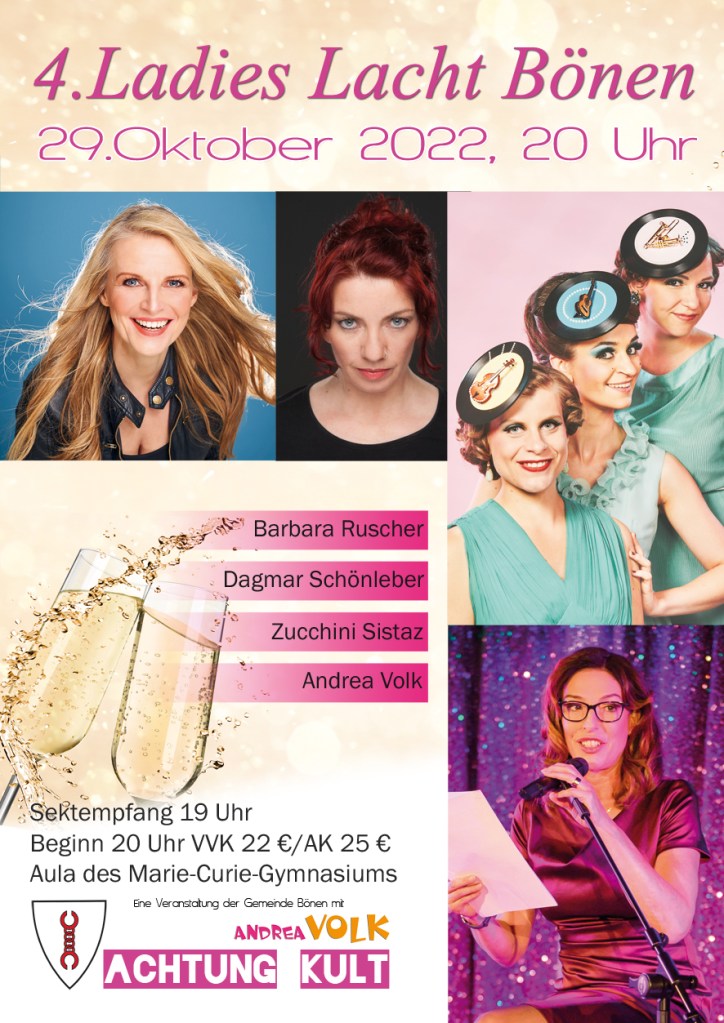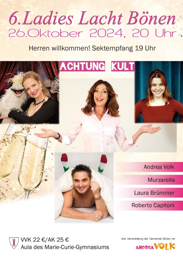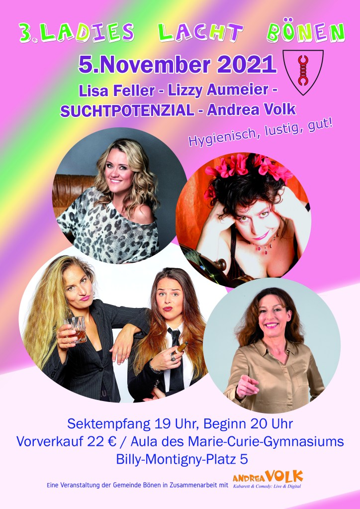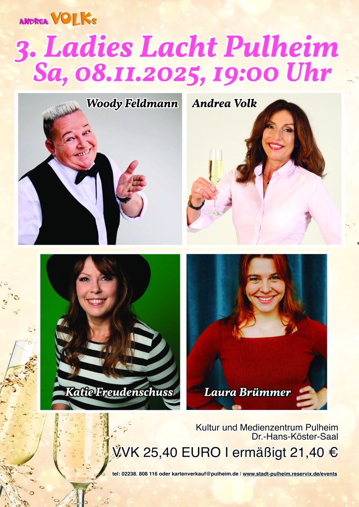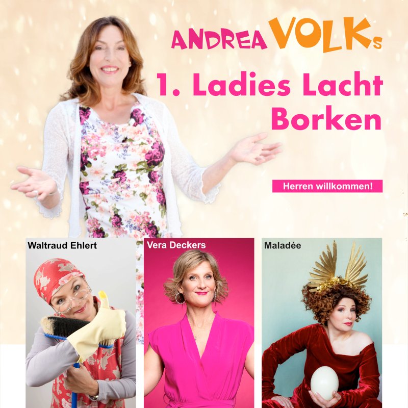 Standing Ovation, Lachsalven, Schnappatmung – für Stadthallen, Kulturämter, Gemeinden; Kurz: für Menschen mit Budget-Hintergrund: ‚Andrea Volks Ladies Lacht‘. Um die 500-1000 überwiegend weibliche Gäste, genießen Volksche Vielfalt. Mit Frauen, Frauenden, „gebärenden Elterteilen“ und Baumwipfeln; Quotenmännern und -männchen: Woody Feldmann, Laura Brümmer, Christin Jugsch, Lisa Feller, Daphne de Luxe, Suchtpotential, Barbara Ruscher, Carmela de Feo, Vera Deckers, Waltraud Ehlert, Hansy Vogt, Katie Freudenschuss, Elke Winter u.v.m. …